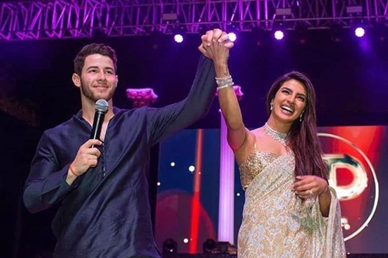During the filmi style Sangeet ceremony cum cocktail party both the sides set the dance floor on fire with their smashing performances. Priyanka was looking every bit a stunner in a hand embroidered sequin gold and silver designer saree with noodle strap blouse. A dazzling diamond statement neckpiece accessorised her look.
