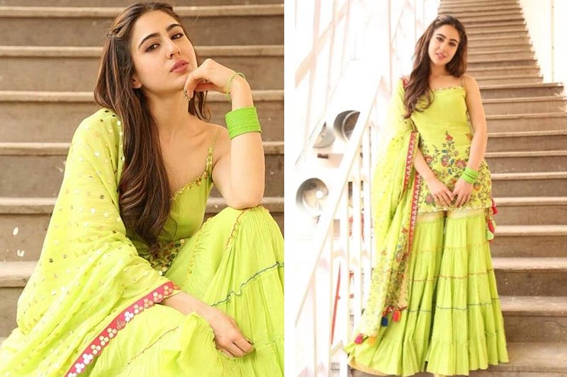 During the promotions of Kedarnath, Sara is spotted in lime green sharara suit. The layered sharara was paired with short cotton kurti with floral embellishments and gota work dupatta with tassel details. She completed her look with matching bangles and juttis.