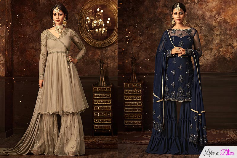 Sara Ali Khan brought back the sharara suits in fashion. Up your sartorial game with Like A Diva's Embroidered Net Sharara Suit in nude colour or Floral Embroidered Tiered Sharara Suit in navy blue.
