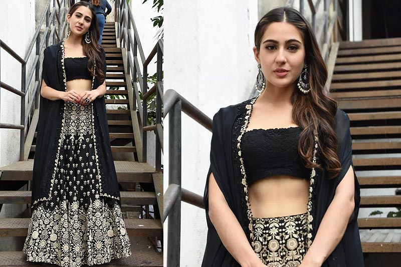 Sara's black lehenga became the talk of the town. She teamed floral embroidered lehenga with black choli and a matching cape jacket. Chandbalis, nude lips and a wavy hairdo rounded off her look.