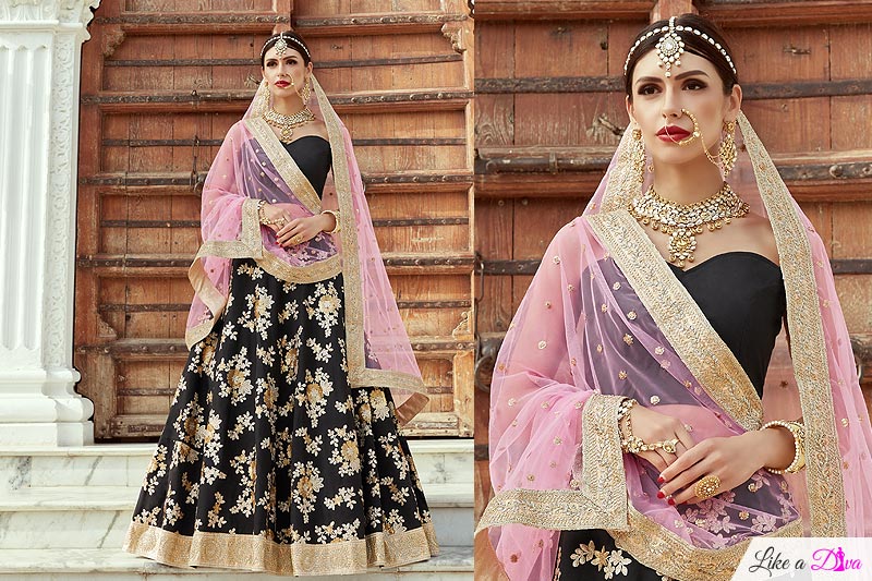 You too can look gorgeous like Sara in this black designer embroidered lehenga choli. The crepe silk lehenga features beautiful floral embroidery all over with rich zari and sequins work. The hem of the lehenga is bordered with a beautiful lace. It is teamed with black crepe silk choli/blouse and a baby pink net dupatta. The dupatta is lace bordered and features small butis with sequins work.
