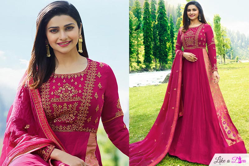 You too can add a pop of pink to your traditional wardrobe and rise up on fashion-o-meter with this Prachi Desai's zari embroidered Anarkali Suit. This georgette floor-length anarkali features delicate floral zari embroidery on bodice, sleeves and back with stone work. The anarkali has a snazzy twist to its design with a rich floral pattern jacquard panel on a side. You can explore and shop anarkali suits at Like A Diva.