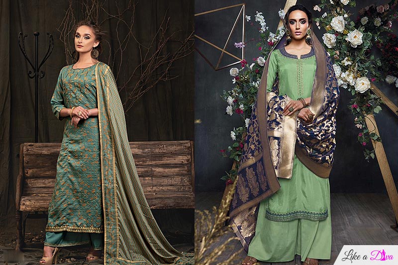 Add a minty freshness to your look with this mint green embroidered palazzo suit in luxurious silk fabric! The mint green kurti is embellished with zari and thread embroidery with sequins and stone work along the neckline and hem. It is teamed with matching palazzo. Beautiful navy blue Banarasi jacquard dupatta complement the ethnic look. Round off your look with traditional jhumkis and statement rings.