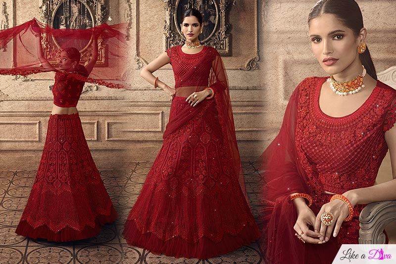Red is the colour of the wedding season. Flaunting this auspicious wedding colour, you too can nail the ethnic look like Priyanka Chopra. Her bridal lehenga became the talk of the town. If you are looking for a red lehenga your search will end at Like A Diva.