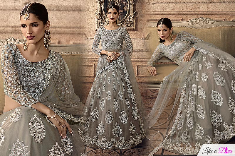 Bring out the celebrity hidden in you with this alluring steel grey designer number and add to your captivating charm! Intricately embroidered motifs accentuate the beauty of the ensemble. Complete your ethnic look with traditional jewellery.