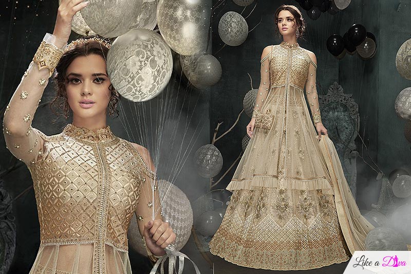 Deciding on the outfit to be worn on the auspicious occasion can be a bit tricky. But help is here, we would suggest picking an ethnic ensemble like designer anarkali suit, lehenga choli, saree, anarkali lehenga or anarkali with pants. We are crushing on this cold shoulder collared jacket style anarkali with lehenga. It’s perfect ensemble to flaunt this Raksha Bandhan.