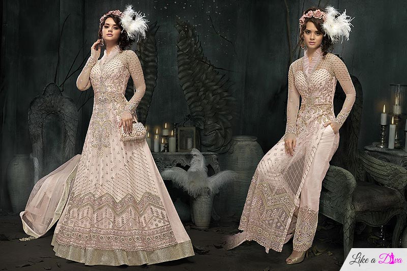 You can also give your look an Indo-western twist with fusion attire. To slay festive look in a fusion outfit, this powder pink back trail anarkali is perfect as it can be teamed with pants or lehenga both.