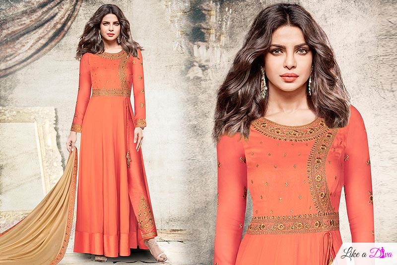 Most women love to go with celeb inspired looks. This Raksha Bandhan, you too can wear this peach side slit georgette anarkali worn by the global icon Priyanka Chopra and look like a true ethnic diva.