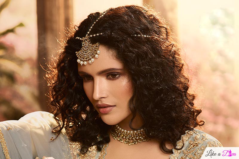 To complement the angelic look, keep your hair wavy. Leave your hair open, soft curls cascading over your shoulders. Golden highlights will accentuate the style. Adorn a headgear to accessorise your hair.