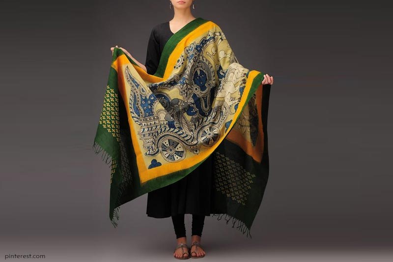 Block printing, quirky designs and bold prints are the features of Kalamkari dupattas. These have bold dark colours and free-hand designs. Pair it up with a not so heavy salwar kameez & you are all set with a new look.