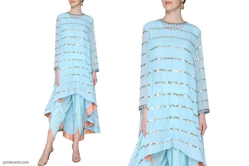 Somewhat similar to the typical salwar style, dhoti salwar is just like traditional dhotis. These have several pleats & are mostly ankle length. You’re definitely going to make a style statement by combining a dhoti salwar with a plain top.